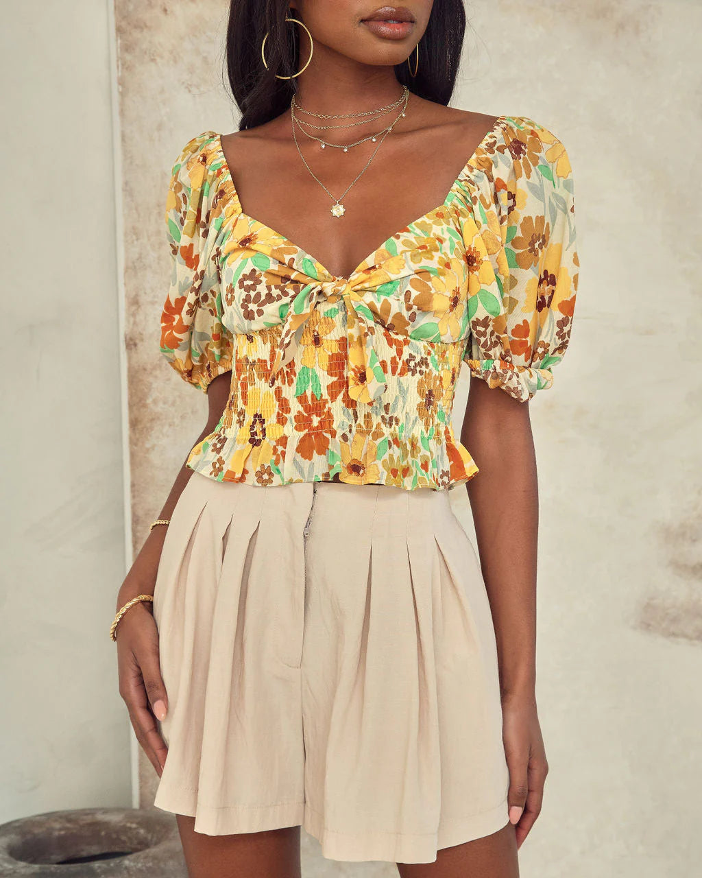 Cropped Fit 100% Rayon Hand Wash Cold. Hang Dry Midi Length V-Neckline Front Tie Puffy Sleeve Smocked...