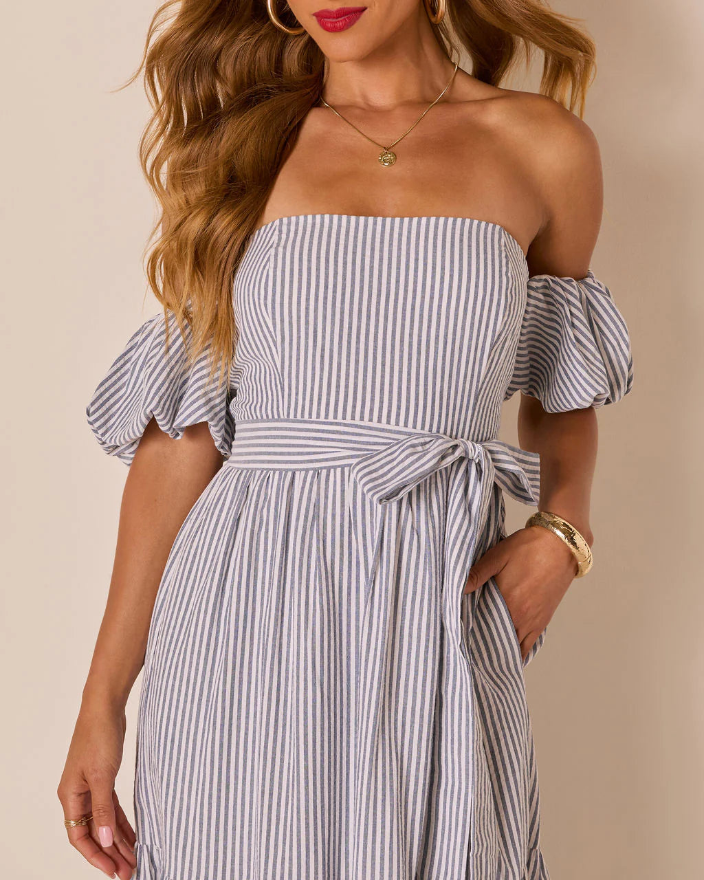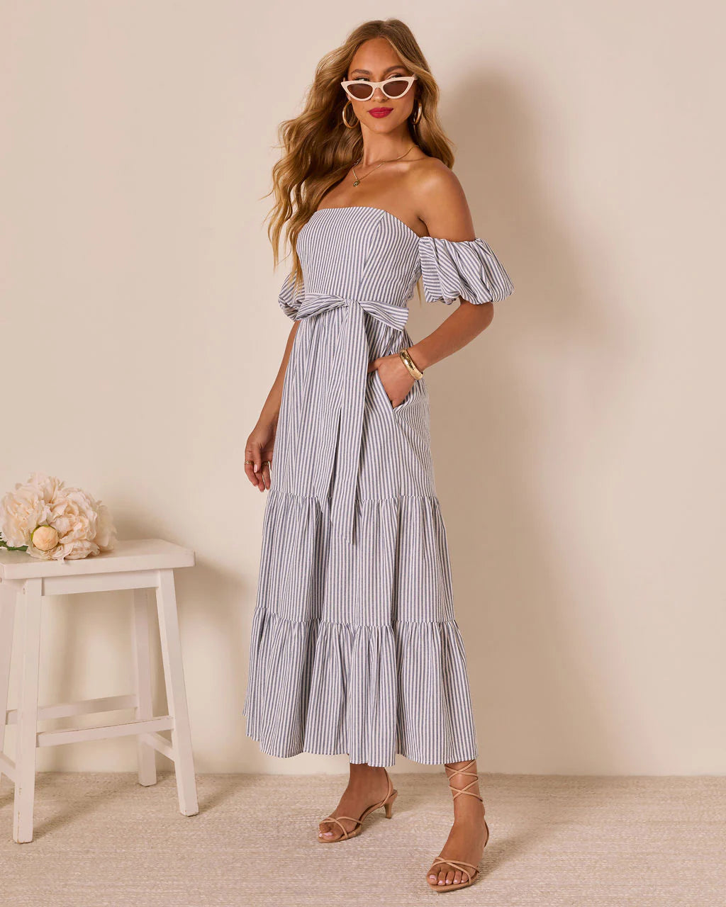 Sunset soirées. coastal getaways. or Sunday brunch the Annah Striped Off The Shoulder Maxi Dress is ready...