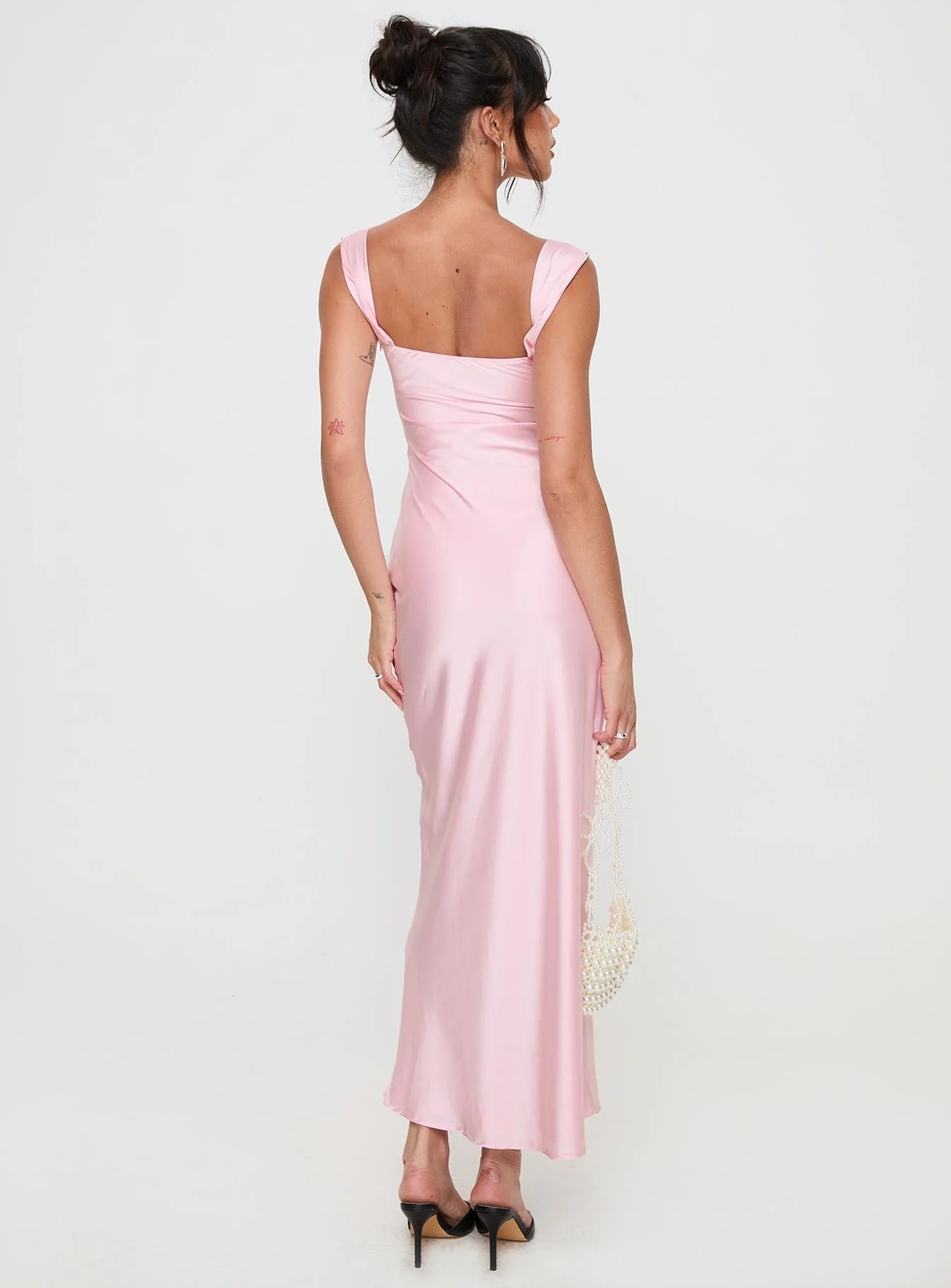 Off the shoulder maxi dress Satin material. square neckline. ruched detailing at bust. inner silicon at bust....