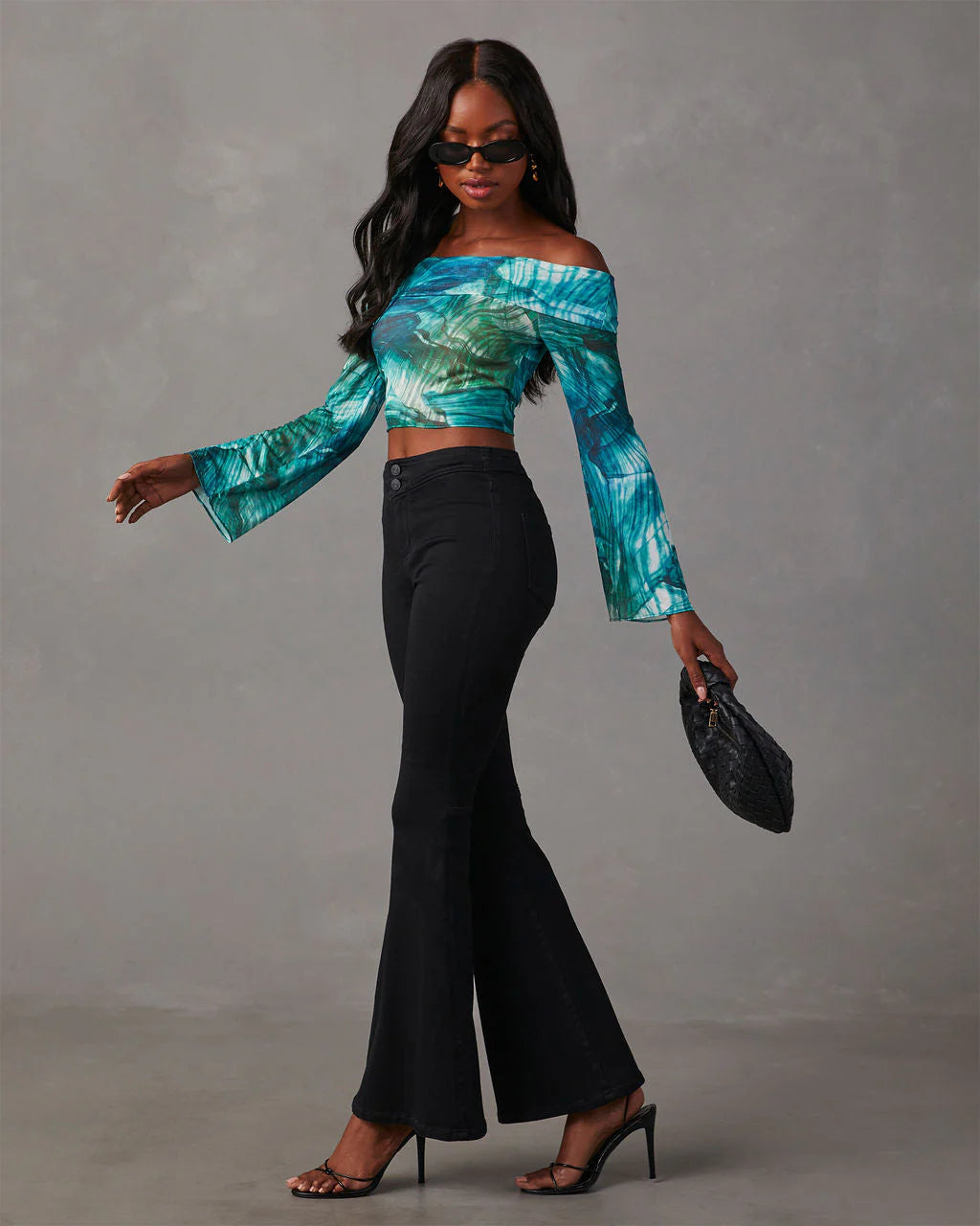 â—?Fitted & cropped â—?Off the shoulder neckline â—?Long sleeves â—?Mesh tropical print â—?No closures or lining