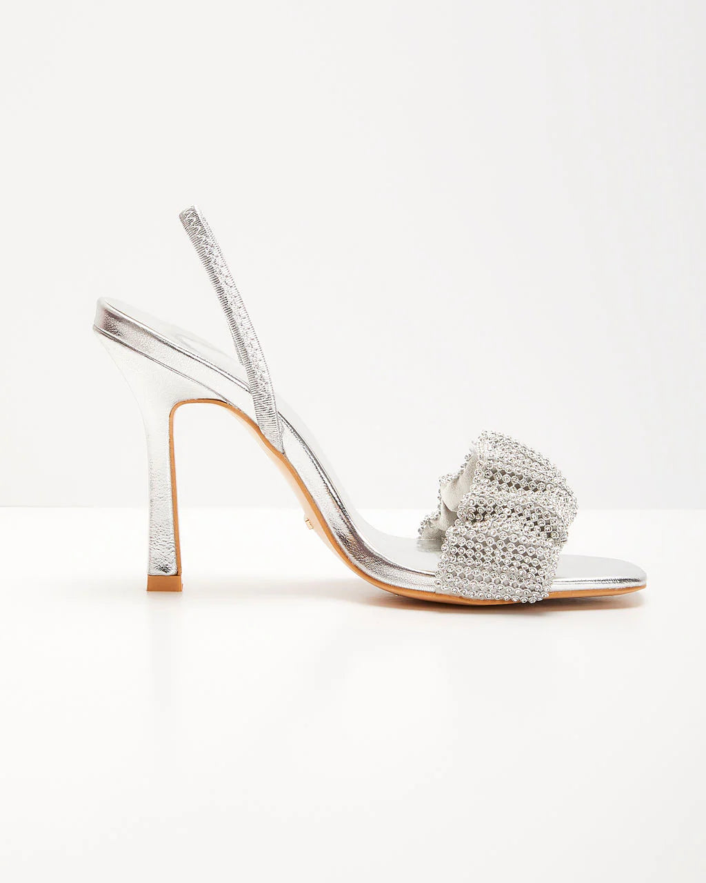 Take flirty and feminine to the next level with this diamond encrusted scrunchie strap heel. It features...