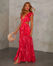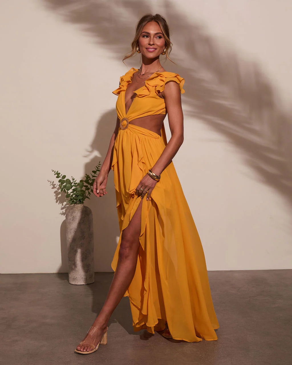 Embrace playful sophistication in the Carlita Ruffle Cutout Maxi Dress. Crafted from airy ruffle chiffon. this dress...
