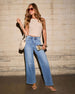 High Rise Wide Leg Fit Frayed Hem Medium Wash Whiskering Detail 5 Classic Pockets Front Zip Fly...