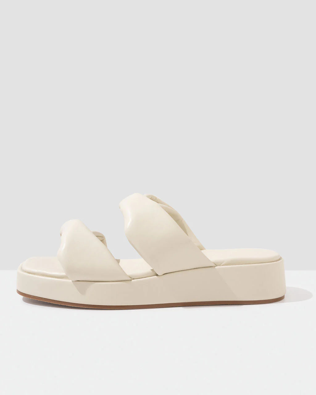 NOT ELIGIBLE FOR DISCOUNT. Platform Height: 1.5" Open Toe Faux Leather Padded Footbed