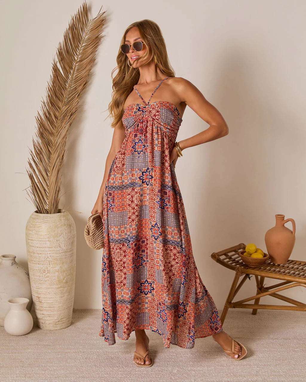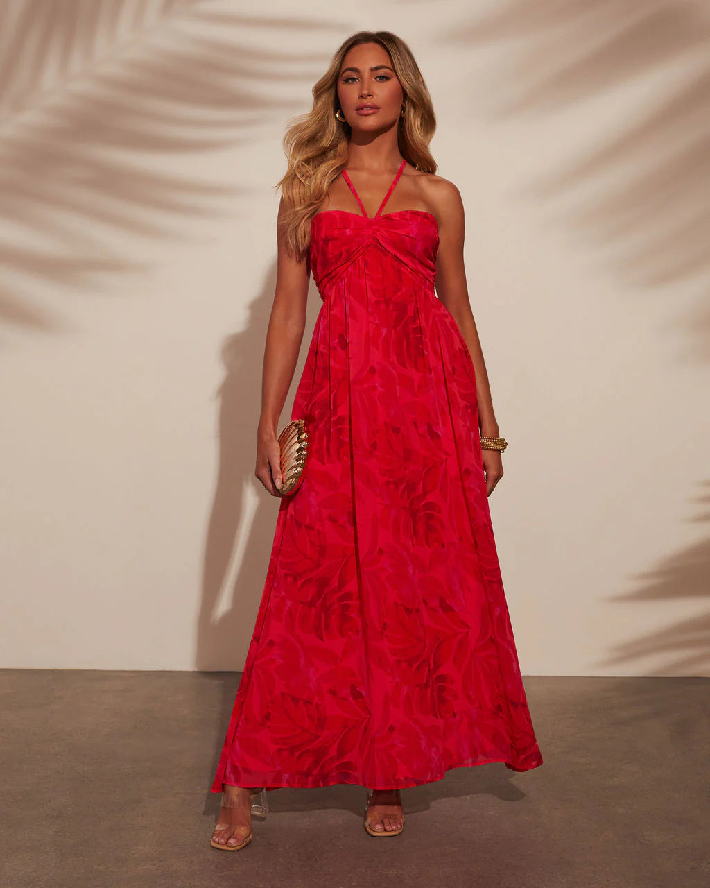 Embrace the essence of summer sunsets with the Eliora Tropical Print Halter Maxi Dress. Crafted from lightweight...