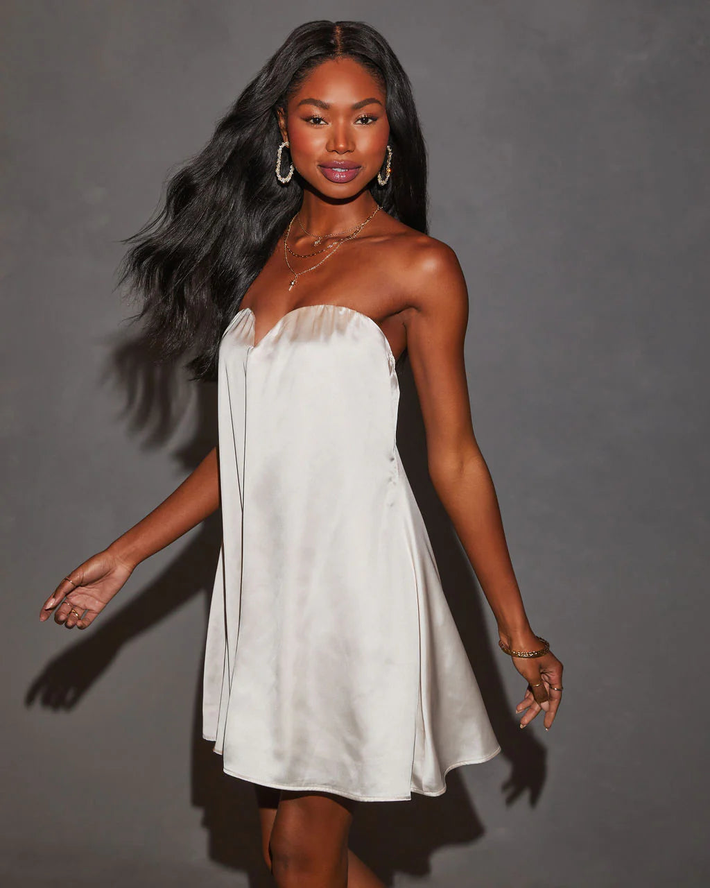 Wire frame sweetheart neckline Strapless Satin fabrication Elastic back seam Mini length Lined 96% Polyester 4% Elastane...