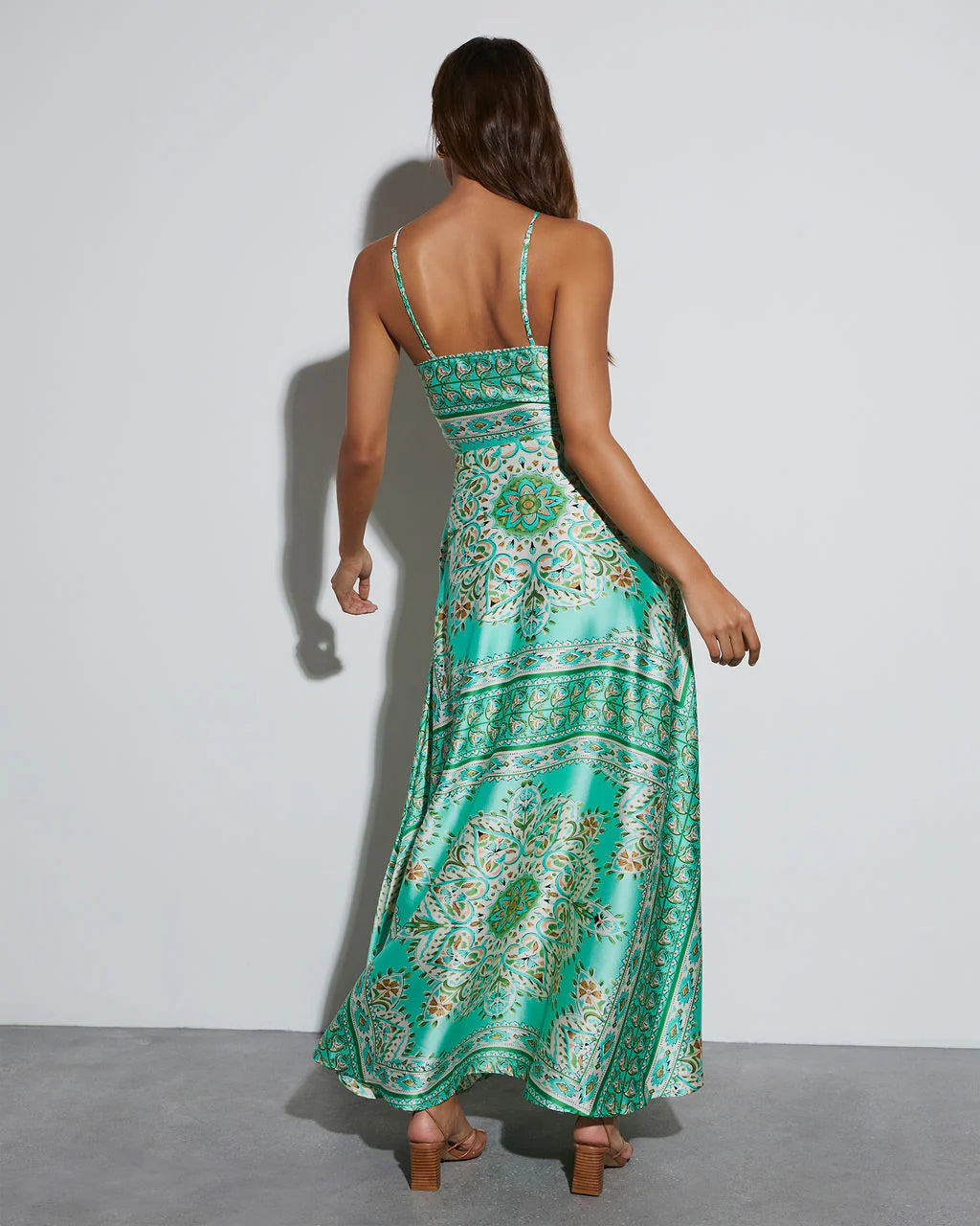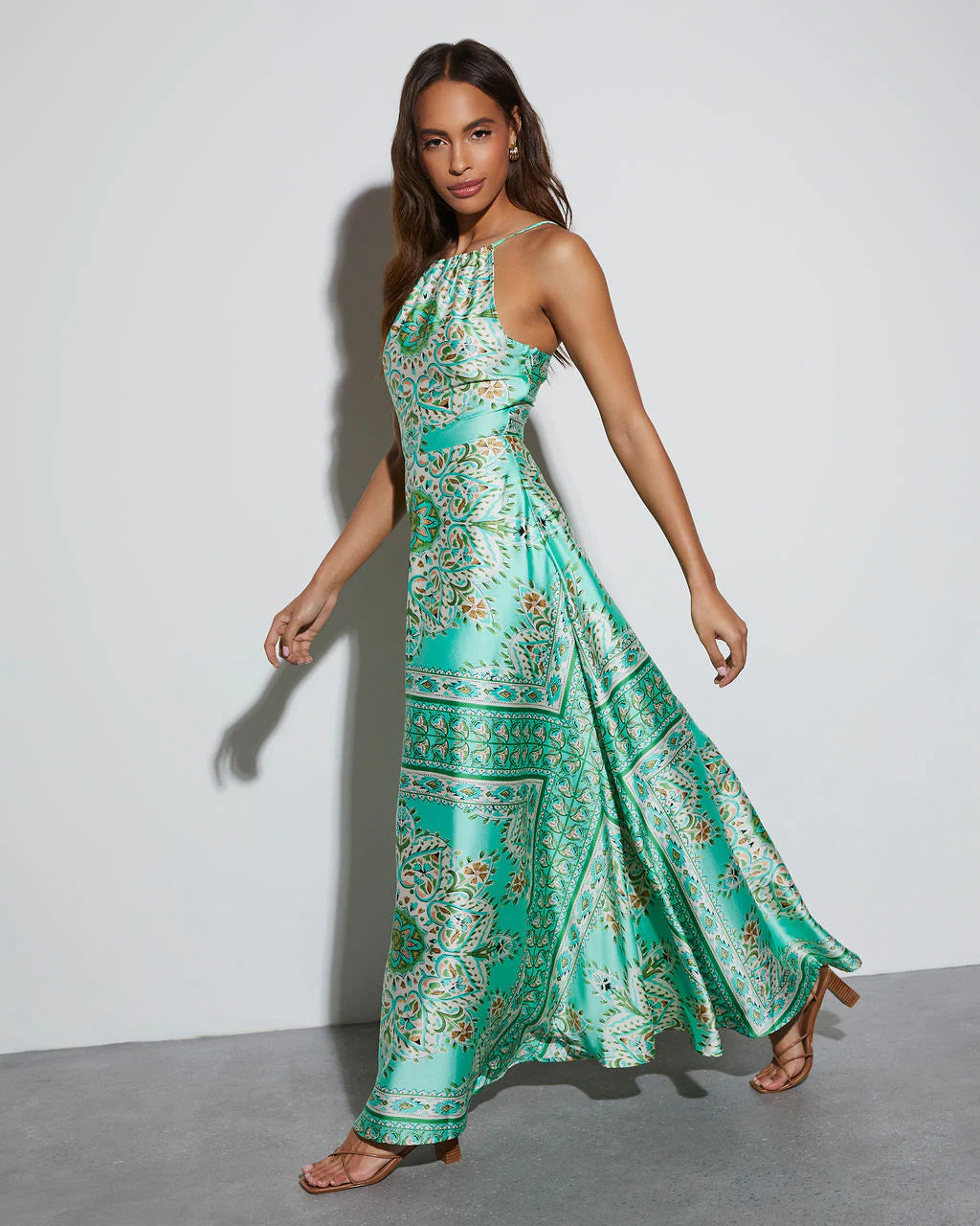 Pack this for your next fancy. resort getaway. The Gayle Satin Printed Maxi Dress makes an entrance...