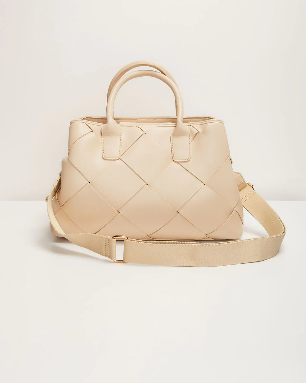 FINAL SALE. Dimensions: 13.75�L x 4.875�W x 8.875�H Material: Vegan Leather Magnetic snap closure Woven design. top...