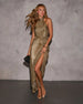 Make a dazzling entrance and celebrate in style with the Gisella Metallic Halter Maxi Dress. This show-stopping...