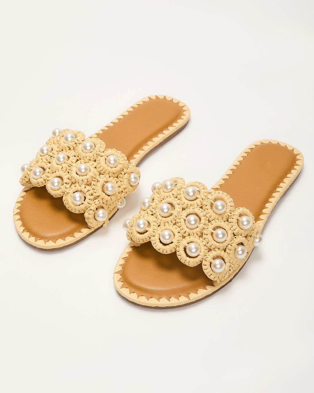 Step into effortless coastal chic with the Golden Coastline Crochet Pearl Sandals. These beauties are designed to elevate your vacation wardrobe with their stunning woven raffia and luxe faux pearl accents. The slip-on style makes them a breeze to wear. while the playful yet sophisticated design adds a touch of glam to any outfit.