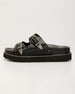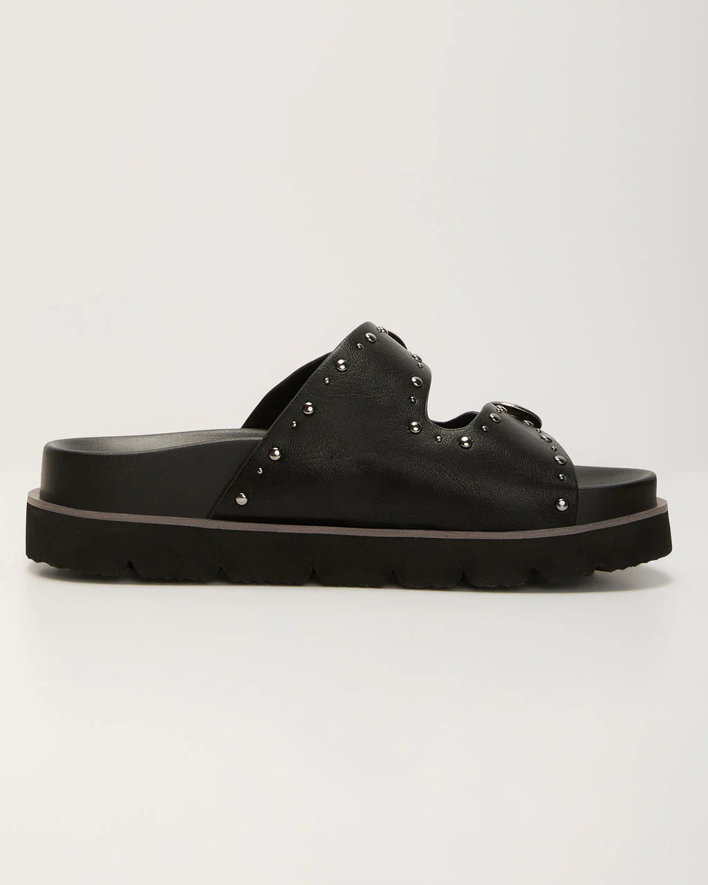 Kick up your heels with the Hadyn Western Studded Buckle Sandal �the perfect blend of bold and flirty. These slip-on sandals feature a studded vamp with dual buckle accents that bring just the right amount of edge to your romantic look. With a molded footbed for ultimate comfort. you'll be dancing through the day and into the night without missing a step. The smooth faux leather fabric adds a luxe feel while keeping things effortlessly cool.