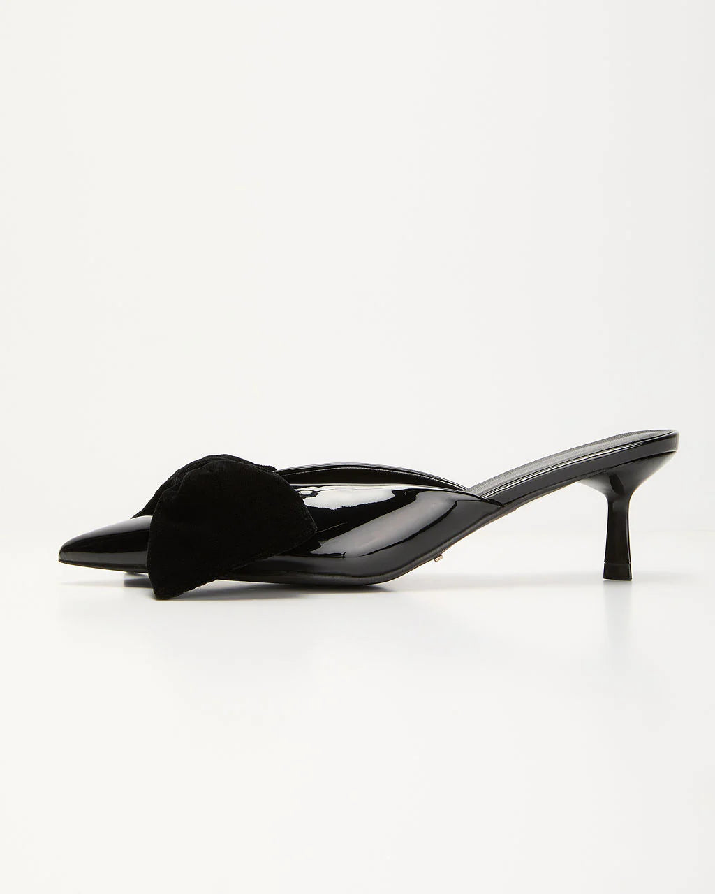 Step into the holiday season with the Holiday Charm Bow Kitten Heel Mule. where elegance meets playful flair. Made from glossy patent leather fabric. these mules add an eye-catching shine to any festive ensemble. The oversized velvet bow accent makes a bold. fun statement. while the pointed toe keeps things chic and sophisticated. With a comfortable kitten heel. you'll be ready to mingle and dance the night away in effortless style.