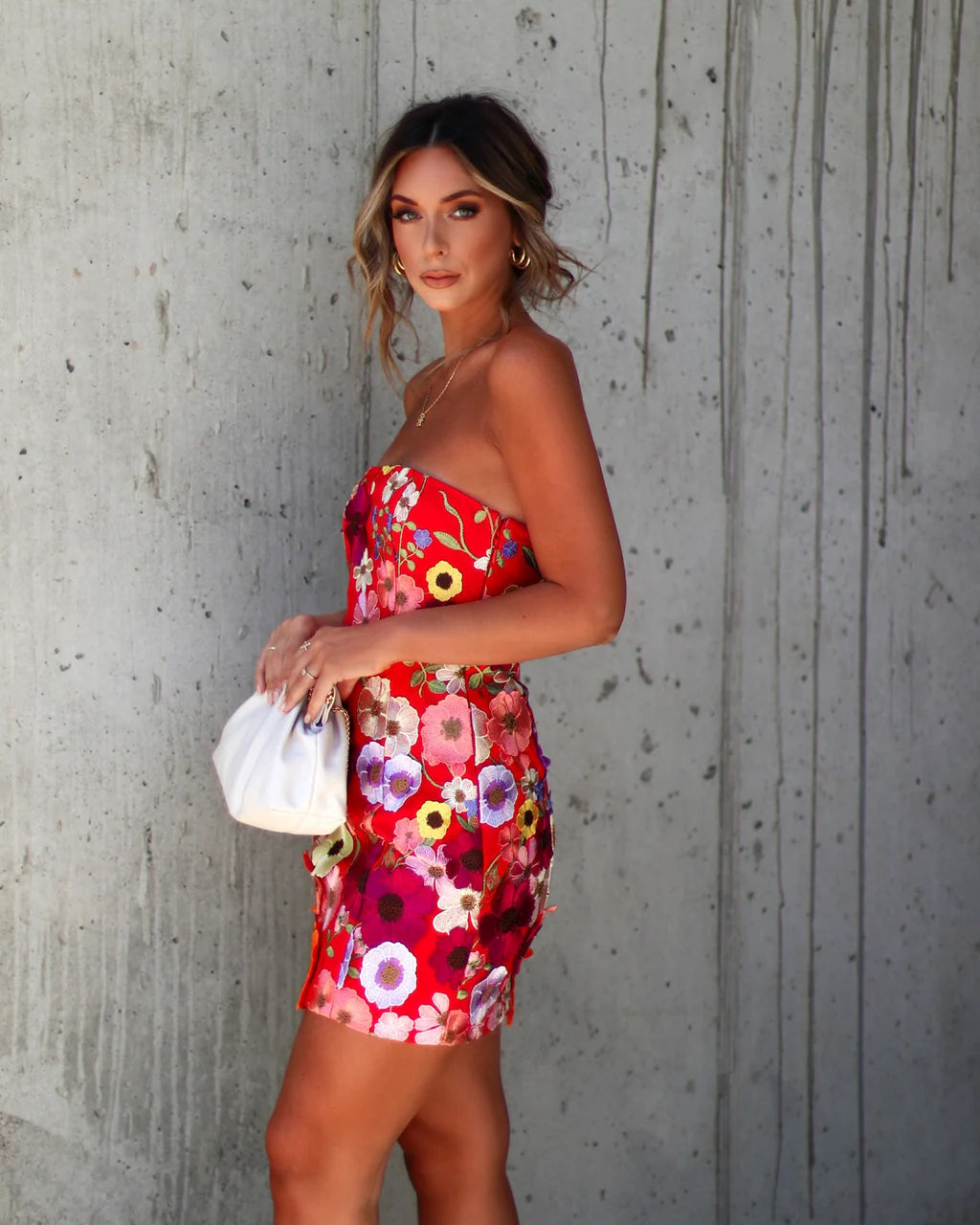 Whether you're toasting the newlyweds or hitting the dance floor. the the Imani Strapless Floral Applique Mini Dress is your go-to for unforgettable moments. This enchanting piece features a lightweight mesh fabric adorned with 3D floral appliques that add a touch romance. The non-slip silicone grip trim at the neckline ensures you can dance the night away without a worry. With its playful mini length and effortless silhouette. this dress is perfect for making a statement.