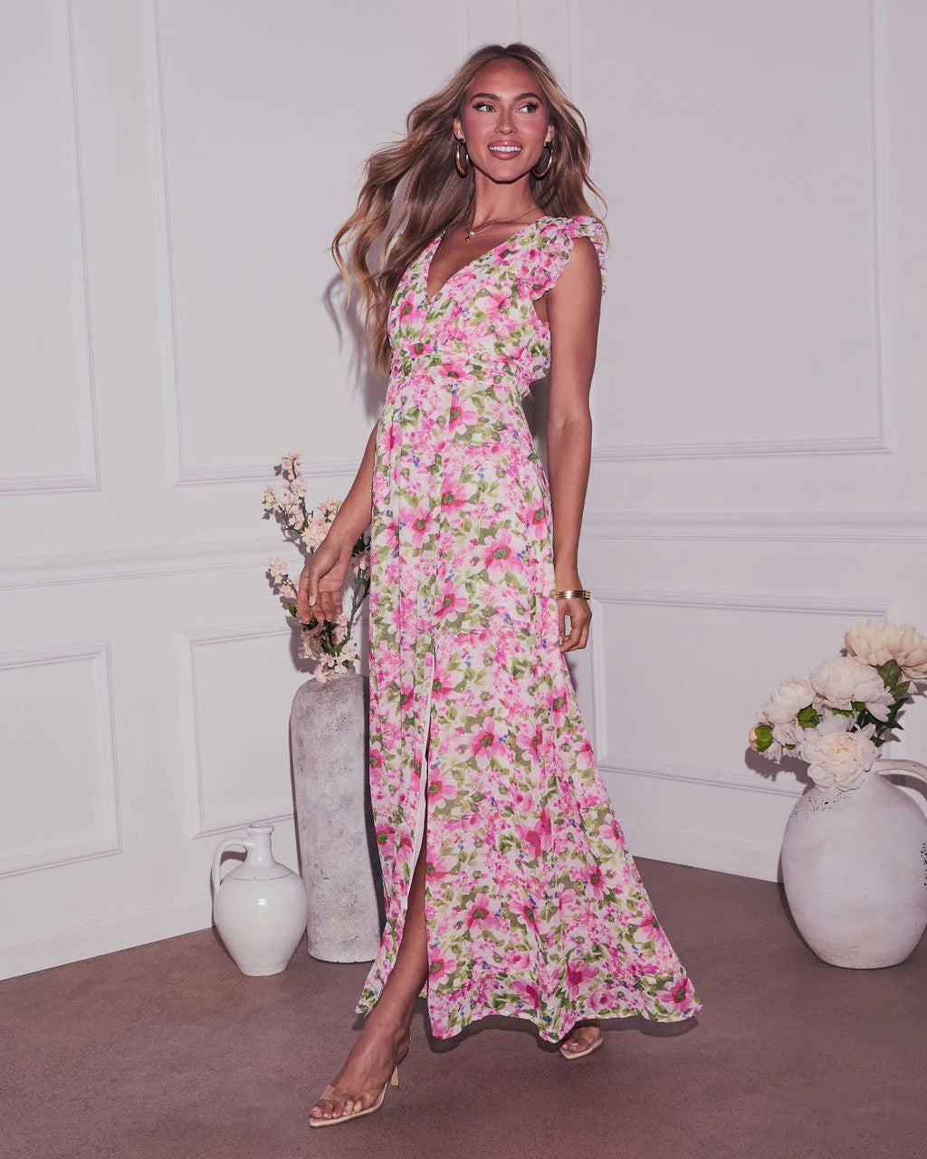 Step into effortless elegance with the In The Garden Floral Print Maxi Dress. Crafted from lightweight chiffon...