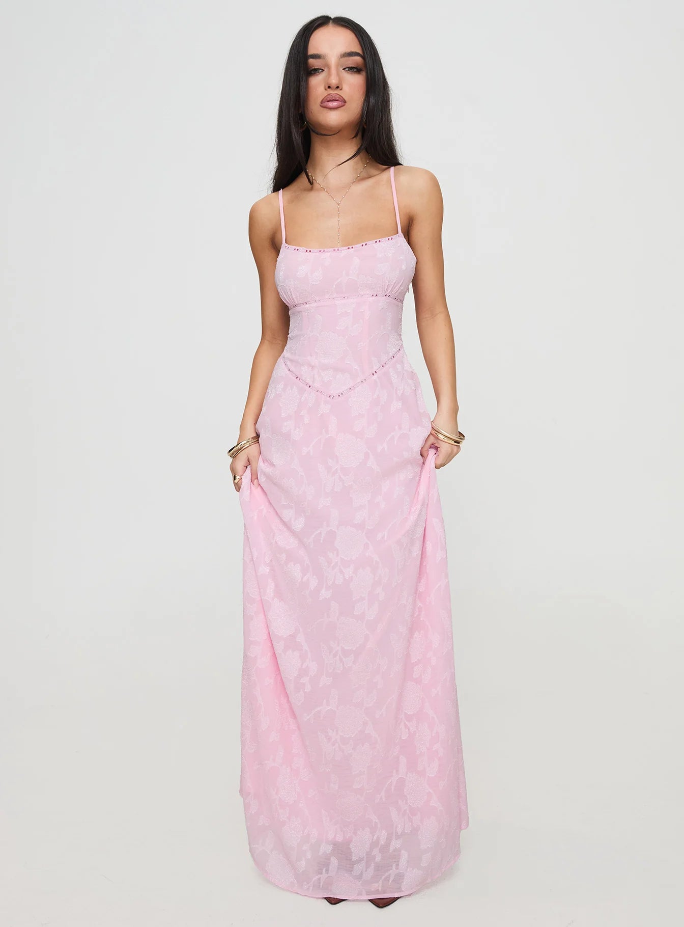 Princess Polly Petite Maxi dress Floral detail. straight neckline. invisible zip fastening at back. open back with...