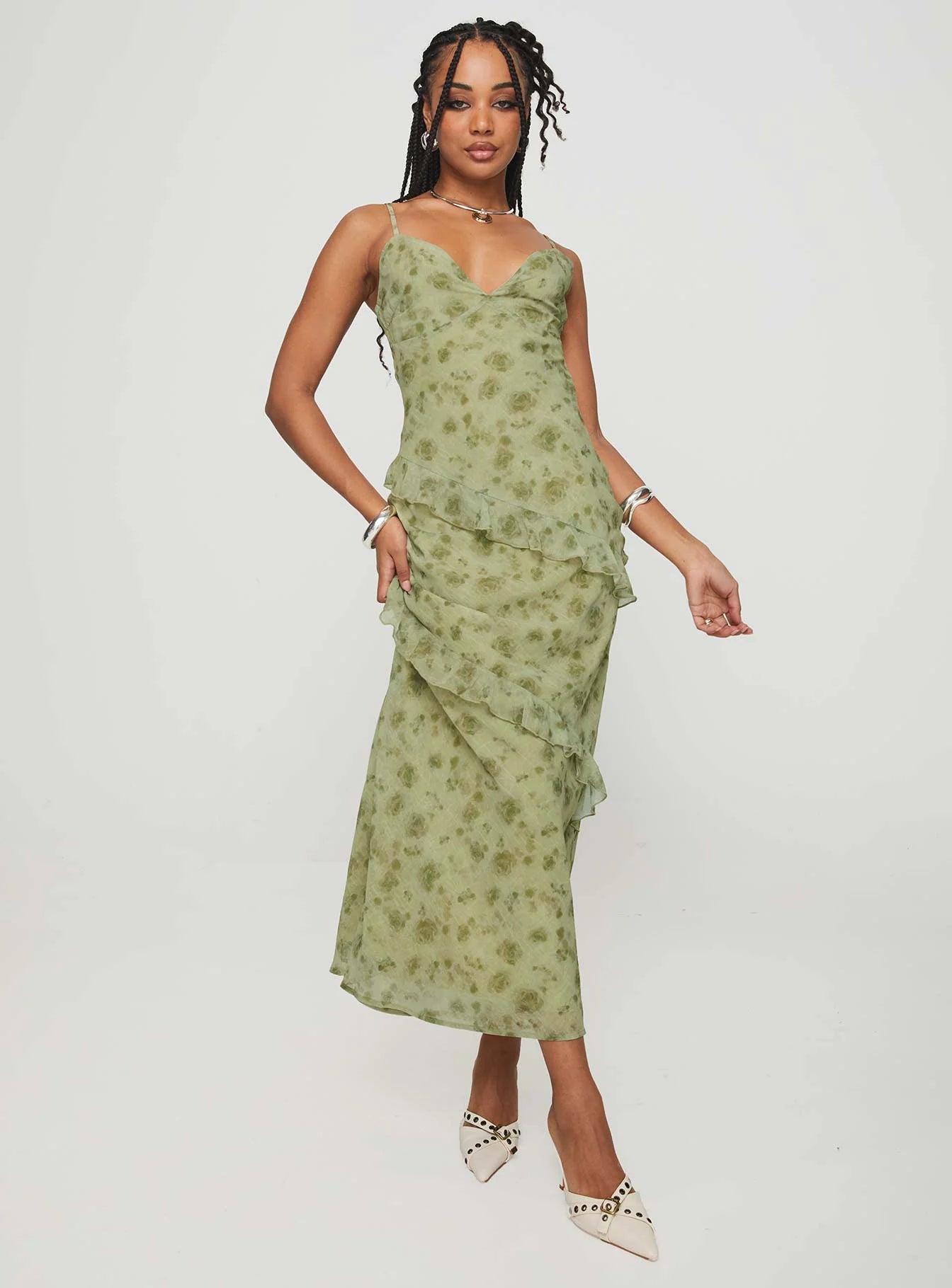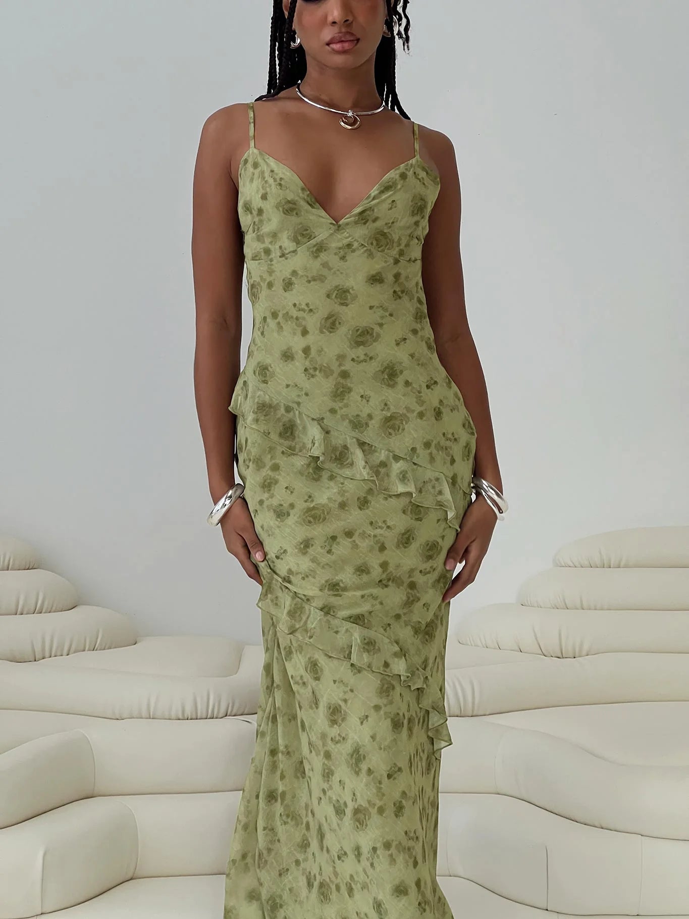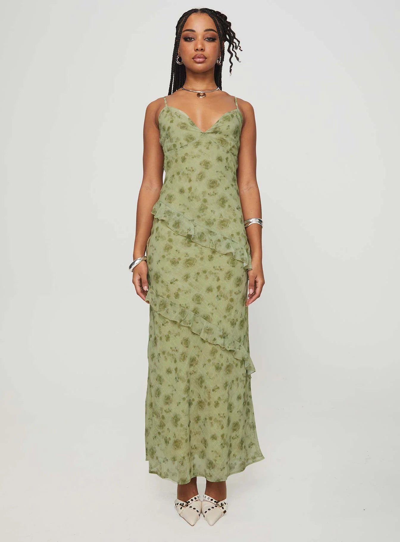 Maxi dress Floral print. sweetheart neckline. adjustable shoulder straps. invisible zip fastening at side. layered ruffles detail...